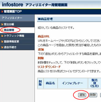 ▼商品の追加 左側のメニューに「商品管理」という項目がありますのでこちらをクリックしますと 画面右側が切り替わって「追加」というボタンが現れますので こちらをクリックしてください