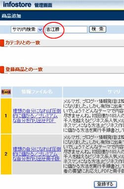 ▼商品検索 「検索窓」に吉江勝と入力し「検索」ボタンを押します。するとスーパービジネスマン養成講座で発行している商材が一覧で出ます。 右側の「登録」のラジオボタンをマウスでチェックして「登録する」を押します。
