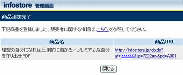 ▼リンク先URLの確認 「登録する」を押すとこの画面になります。 右側の商品URLがあなただけのURLです。コピーして保存してください。 このURLをメルマガ、ホームページで紹介頂くことにより、このリンクから入場された方は全てあなたから紹介された事になります。 このURLから入った方が情報を購入すればあなたに報酬が入ります。